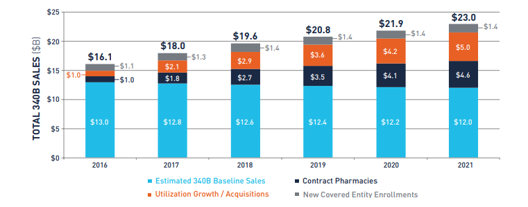 In their white paper 340B Sales Forecast: 2016-2021 Berkley Research Group (BRG) estimated sales growth of the 340B program through 2021. As you can see from the numbers in the following graph, the BRG estimates appear conservative.