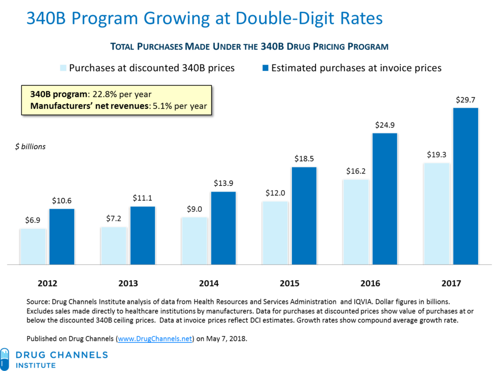 Separate analysis conducted by the Drug Channels Institute shows how quickly the 340B market has grown between 2012-2017, with a compound average growth rate of 22.8% for the period. [Click image to expand]